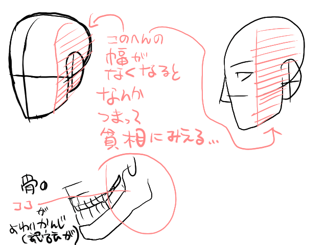 顔の側面(目の終わりから耳の手前というか…)って、顎のエラのあたりが入ってるので、まあまずは下あごの存在を意識してみたらいいじゃない。と思った訳です。