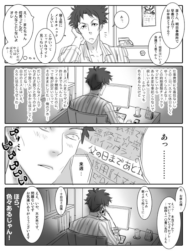 あらすじ:営業マンの小塚は入社以来、密かに同期のライバル・溝呂木を想い続けてきた。社員旅行の夜、溝呂木が後輩の桜庭にキスしたのを目撃してしまう。嫉妬にとらわれた小塚は、溝呂木を脅迫するが…!?