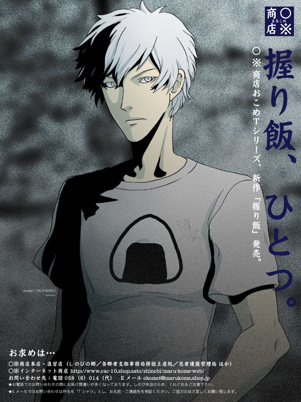 しのびの郷、○※商店の新作Tシャツ、通称「おにぎしT」のポスターにねこGさん・キギルク!のツタヒコ君がモデル出演となりました。