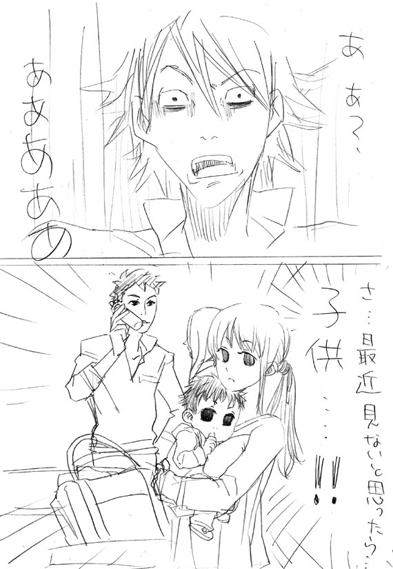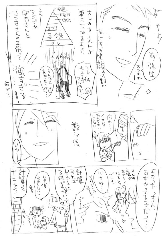 今回の拍手イラスト、内容的には非常に下らないけど、自分は昔からよくやってる(それゆえに最近は描かなかった)モノなんですが(ほんとこんなんばっかり…)、そのくせ参考にしているものがなくて記憶だったり自分のモノだったりするので、結構微妙かもしれません…すみません…