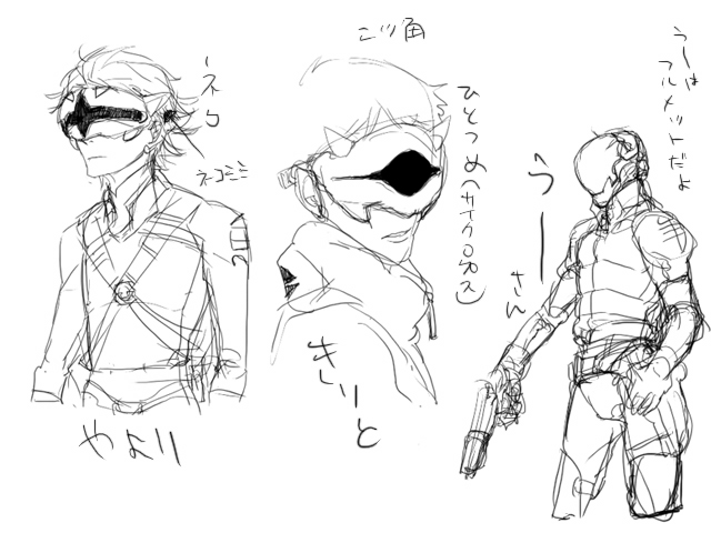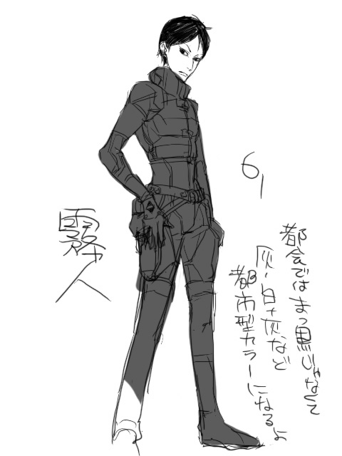 市丸の非現実的な感じっていうのは初期デザイン時にかなり意識していたんですが(絵的な派手さとか優先させた)、霧人は装束も含めて「現実的・有り得る」方向性なので、体型もそんな感じ。あと、頑丈だけど骨がそこまで太くない(宍雄・卯月は骨太の遺伝子)。一見ふつうっぽいけど目つきが普通じゃない、そんな都会派しのびって事でよろしくお願いします。(なにが)
