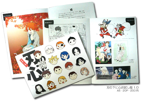 カラーページ・モノクロ落書き・人物紹介・世界観設定などなど…と、「刃の下に心」がどんな話かなんとなく分かる、「刃の下に心」を紹介する冊子です。