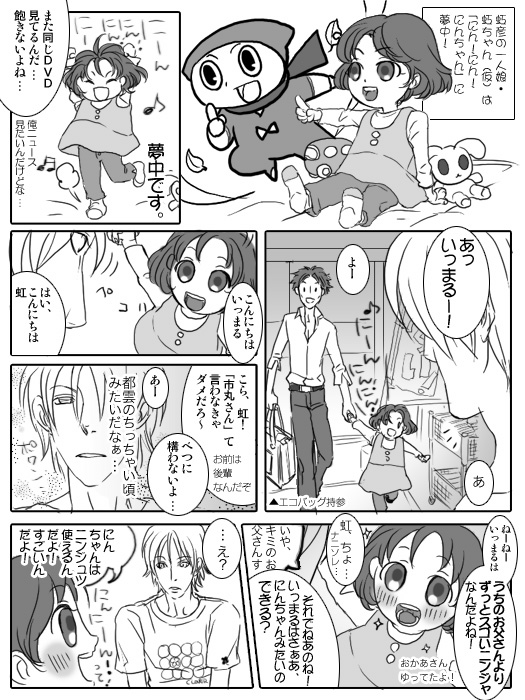 虹彦さんはエコバッグ持参で娘と一緒にお買い物して、いい旦那さんですね。微妙にオシャレだし。ひきかえ市丸の(略)。