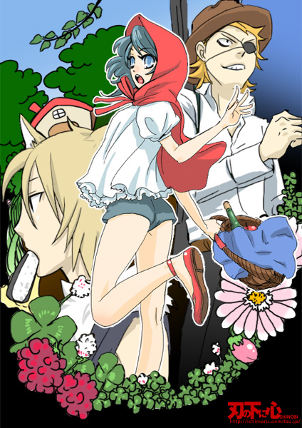 なぜこんな絵になったのか自分でも全く意味がわかりませんが、赤ずきんです。与一にいさんのお使いで三重さんのおうちに行く都雲ちゃんが森で狼に出会うんだよ!でもたぶん狼はいい子です。はらぺこ狼の市丸は自分のお弁当(おにぎり)をくれた都雲になつくとおもうよ!出番がない猟師のニゴさんが大暴れしそうだよね!