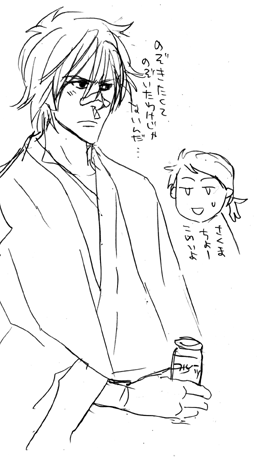 えー、絵板のログをギャラリーに格納しまんた。落書きとかもそうなんですが、そんなに好きか都雲。とか自分で思います。いや、まあこの話自体、市丸が切っ掛けで生まれたから市丸の落書き量が半端ないのは自分でも分かってるんですが(だから正気に返るとちょっと恥ずかしくなって都雲を描く)。都雲も与一も今まで自分では作らないタイプのキャラなので描いてて非常に面白いというのも原因なんですが…そのはずなんですが…
