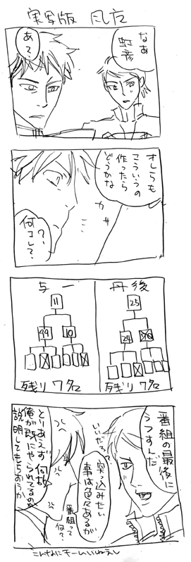 実写ドラマ・風魔の小次郎を見ていないと何がなんだか全然分からんネタでもうしわけないですw。番組の最後あたりにああいう図が出るという。与一とニゴはアホな悪友なので(そして二人で一応モテメンズなんですけどね!)。虹彦さんかわいそう。